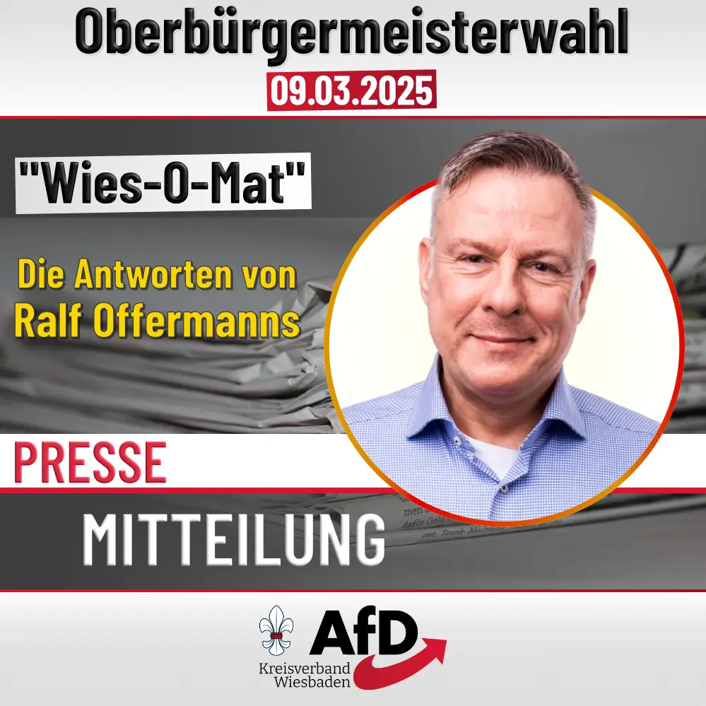 Während bei den letzten Wahlen lediglich ein so genannter Wahl-O-Mat bei der Suche nach der richtigen Partei unterstützend zur Verfügung stand, gibt es für die OB-Wahl eine weitere Variante. Diese wird Wies-O-Mat genannt und wurde von Volt, einer zur Wiesbadener Rathaus-Kooperation gehörenden Splitterpartei erstellt. Wer sich fragt, warum der Kandidat der AfD nicht bei den Antworten erscheint, dem sei folgendes erläutert.
