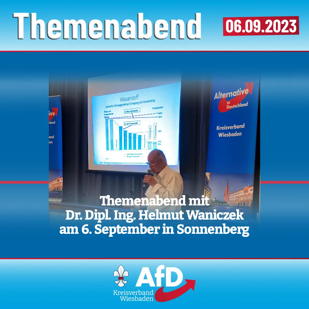 Am 6. September hat der AfD-Kreisverband Wiesbaden in Sonnenberg einen Themenabend gestaltet. Referent war Dr. Dipl. Ing. Helmut Waniczek, er sprach über die politischen Hintergründe, die Technologien, die Folgen und das Scheitern der Energiewende.