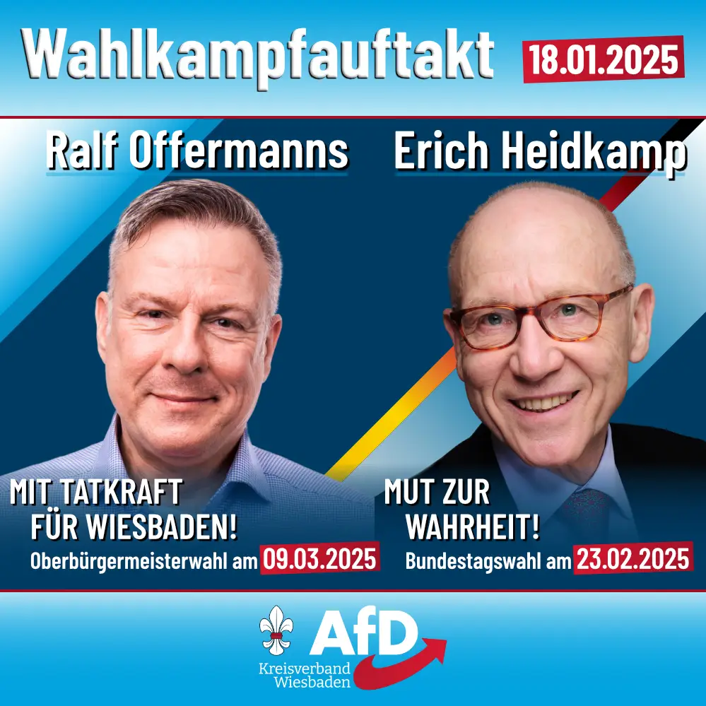 Der Landeshauptstadt stehen in den kommenden Wochen gleich zwei Wahlen bevor. Zunächst gilt es bei der Bundestagswahl am 23.02.2025 den Aufwärtstrend für patriotisch-konservative Politik auch in Deutschland zu bestätigen. Dann, am 09.03.2025, wird das neue Stadtoberhaupt der Landeshauptstadt Wiesbaden gewählt.